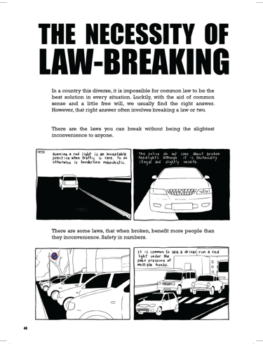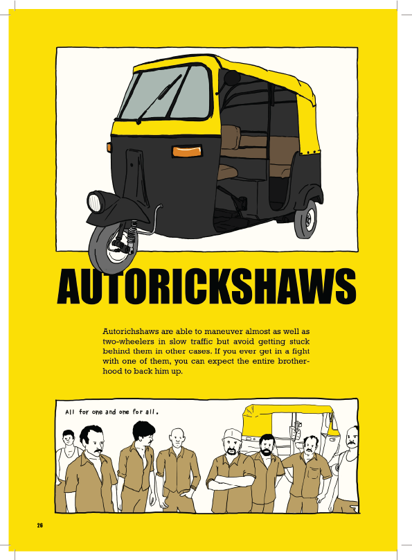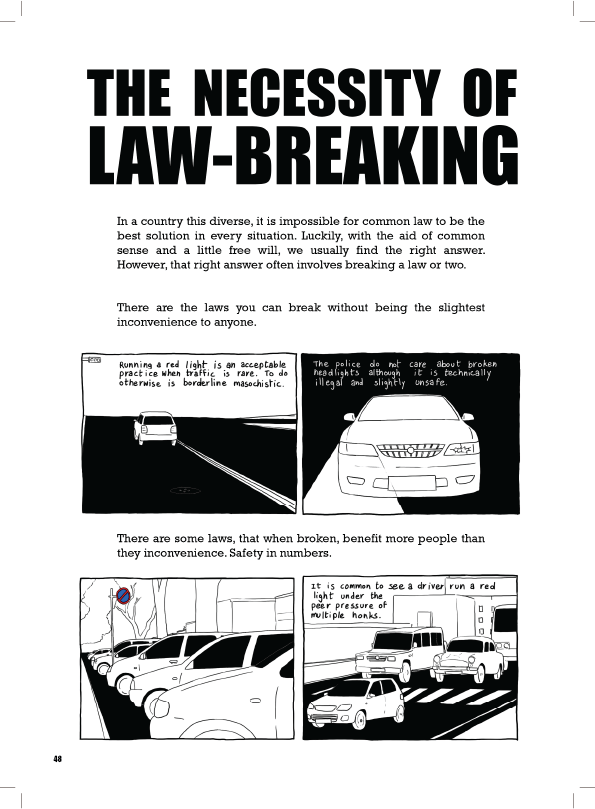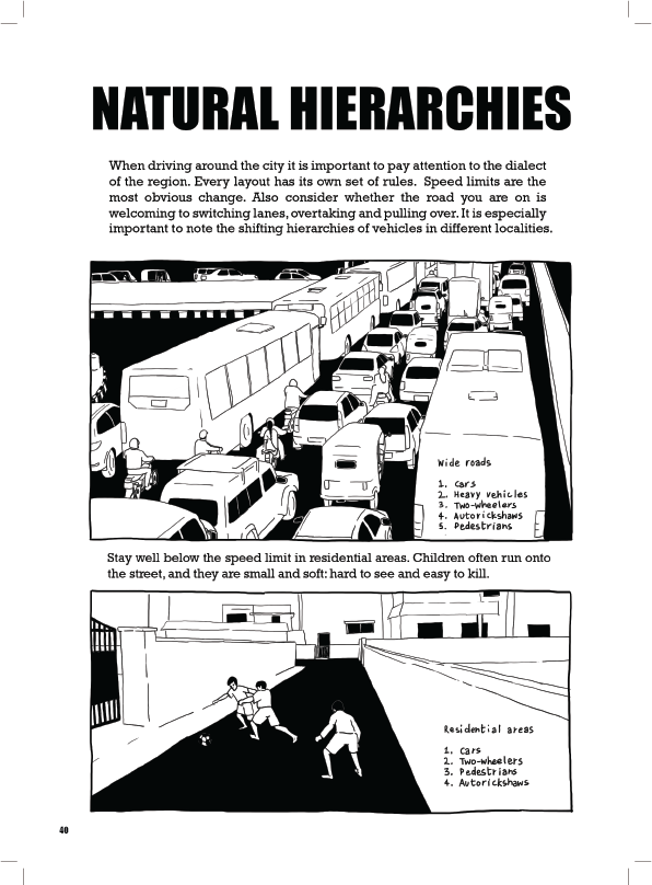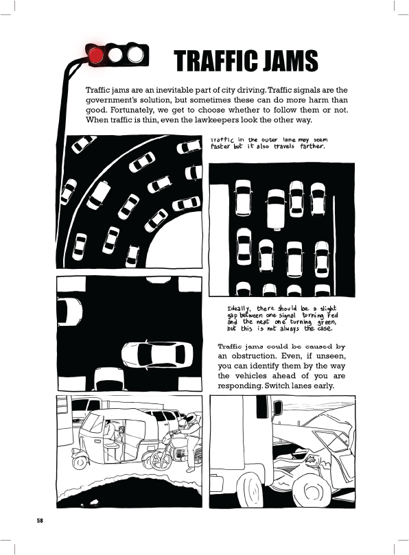 Driving to college and back home I would notice how people behaved on the road was starkly different from what driving school had taught me. Traffic laws seemed like mere suggestions. There was a wildness to street traffic that made driving feel like being in the jungle. Whenever I could I would note down things that seemed absurd, and later sketch what I could remember. The most challenging part of this project was attempting to remember what I had seen while driving as I could not note these things down while at the wheel. All the while, I attempted to portray my observations factually with a touch of humorous insight.