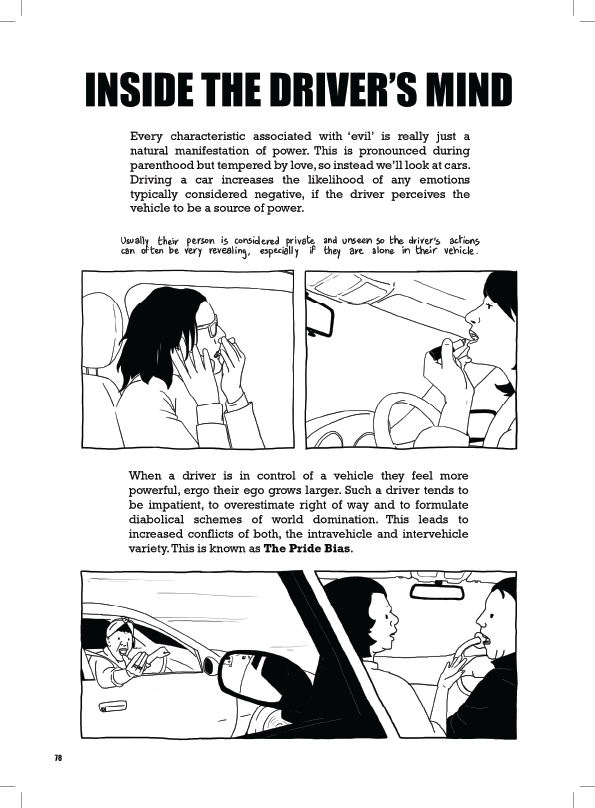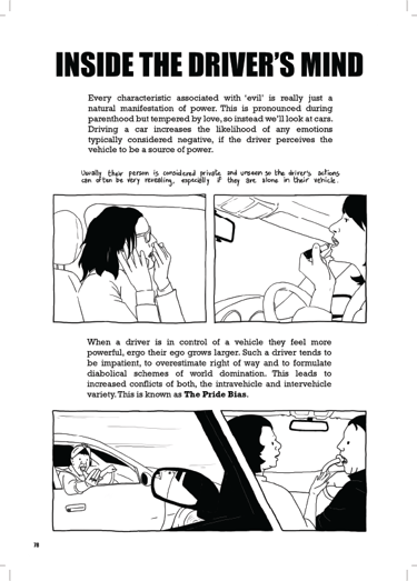 The book details a diverse collection of driving styles and environmental conditions, and then ties them to the contents of the drivers’ minds. The vehicle and its operation are shown to be a form of self-expression.